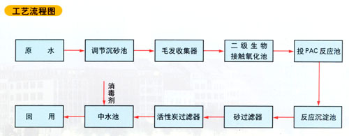 HYS系列中水處理設(shè)備采用生物和物化結(jié)合的處理方法,洗浴等污水經(jīng)中水收集管道自流入調(diào)節(jié)沉砂池,在調(diào)節(jié)池內(nèi)設(shè)有預(yù)曝氣裝置,調(diào)節(jié)池出水經(jīng)毛發(fā)收集器后用泵提升至二級(jí)接觸氧化池,污水經(jīng)生物處理后,進(jìn)入混凝劑,混凝后的水用泵提升至機(jī)械過濾器及活性炭過濾器,污水進(jìn)中水池并投加消毒劑,然后中水送至回用系統(tǒng)。